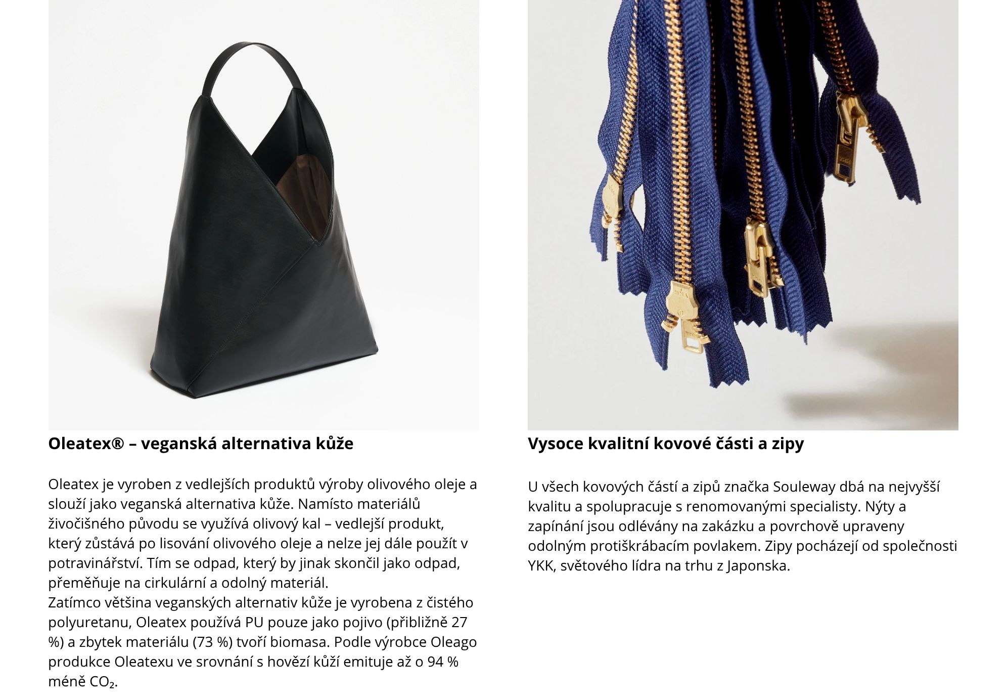 Zatímco polyester a polyuretan dominují v průmyslu s taškami, Souleway se záměrně zaměřuje na přírodní materiály. Jejich první produkty byly vyrobeny z plátna a rostlinně činěné kůže. Odolnost a přírodní kvalita zůstávají dodnes základními principy značky Souleway.