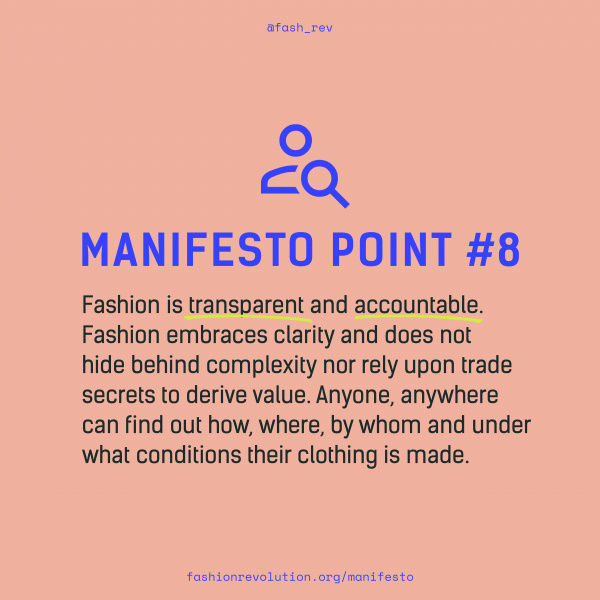 Není to náhoda, ale záměr, že v rámci celosvětového módního průmyslu jsou mzdy dělníků v oděvnictví uměle nízké a že oděvné značky nadále zadávají výrobu oblečení do regionů, kde je nemožné, obtížné a/nebo nebezpečné pro pracovníky zakládat odbory a vyjednávat o svých právech. Globální módní průmysl vytrvale spoléhá na dobrovolné závazky, které dlouho zachovávají status quo. Nedostatek životního minima, svobody sdružování, kolektivního vyjednávání, zdraví a bezpečnosti a sledovatelnosti pokračuje kvůli slabému pokroku v oblasti transparentnosti v těchto oblastech. Zásadním prvním krokem k odpovědnosti je proto větší transparentnost.