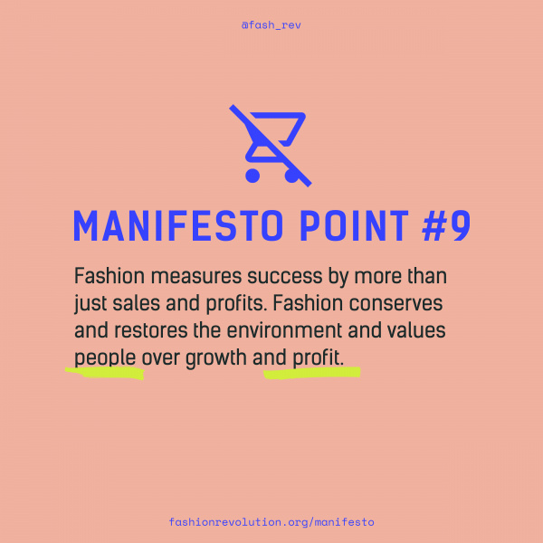 Již v roce 2018 hnutí vytvořilo 10bodový manifest s vizí módního průmyslu, který dává přednost ochraně a obnově životního prostředí a férovému přístupu k zaměstnancům před růstem a ziskem. Od té doby více než 14 000 lidí po celém světě podepsalo výzvu na podporu proměny těchto požadavků ve skutečnost.