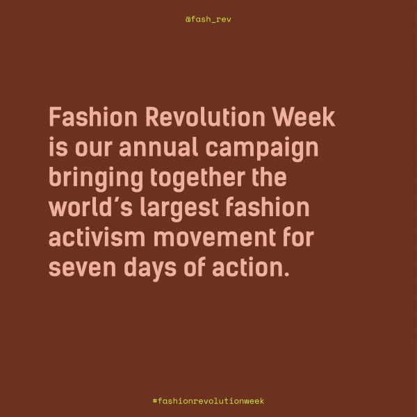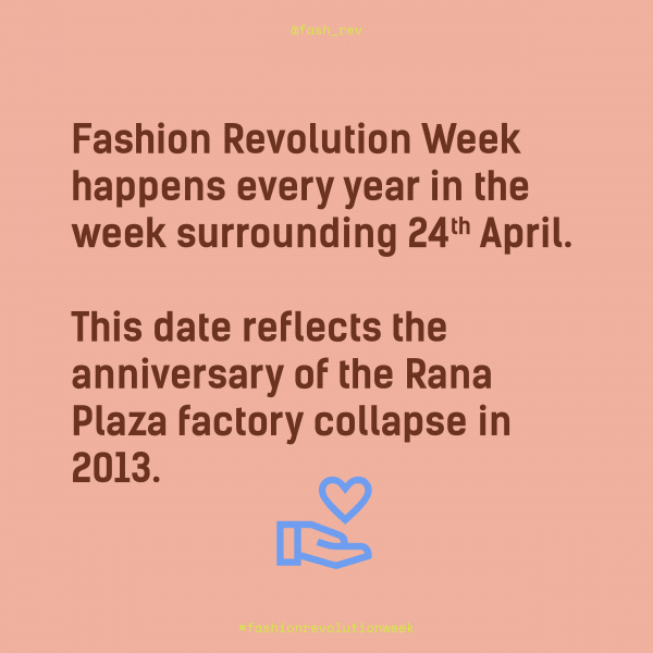 Fashion Revolution Week je již každoroční kampaní světového hnutí módního aktivismu, které napříč 75 zeměmi spojuje všechny, kterým podmínky módního průmyslu nejsou lhostejné. Jedná se o mezinárodní iniciativu, která vznikla v Londýně, v přímé reakci na pád bangladéšské oděvní továrny Rana Plaza, 24. dubna 2013. V jejích troskách zahynulo 1130 lidí a více než 2500 dalších bylo zraněno. Každoročně o takovém čase si tuto tragédii připomínáme a voláme po lepších podmínkách na všech úrovních módního průmyslu - aby nikdo nemusel kvůli módě trpět nebo dokonce přijít o zdraví nebo život. V pondělí 24. 4. 2023 uplyne přesne 10 let od tragédie Rana Plaza a stále ještě bohužel ani zdaleka "nemáme hotovo".