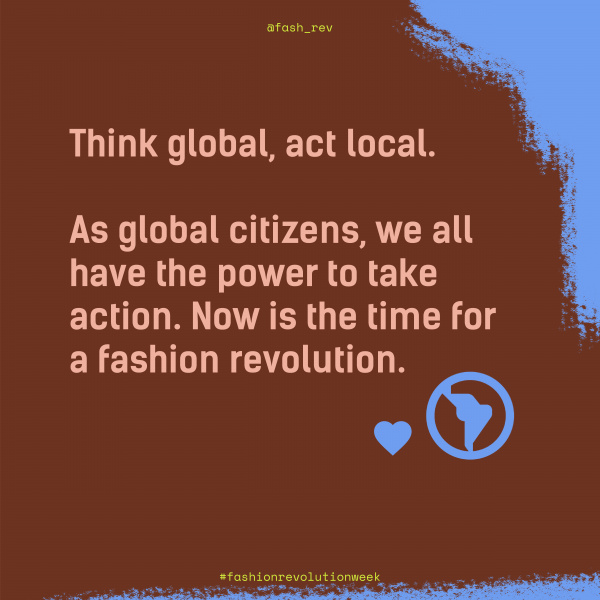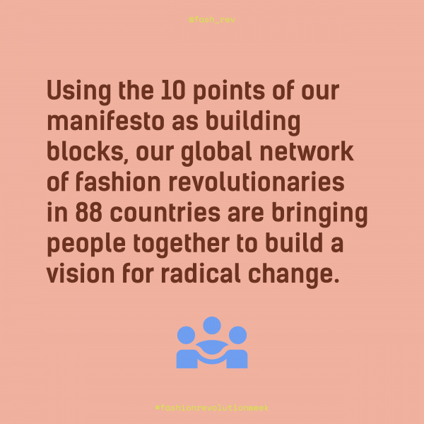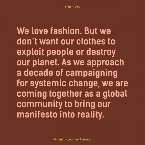 "Věříme, že móda má sice kolosální negativní dopad, ale zároveň má sílu a potenciál být silou změny. Přidejte se k nám a rozšiřte obzory toho, čím by móda mohla – a měla – být. A potřebujeme, abyste se k nám přidali," vyzývá hnutí Fashion Revolution.