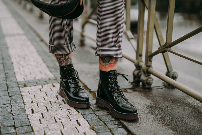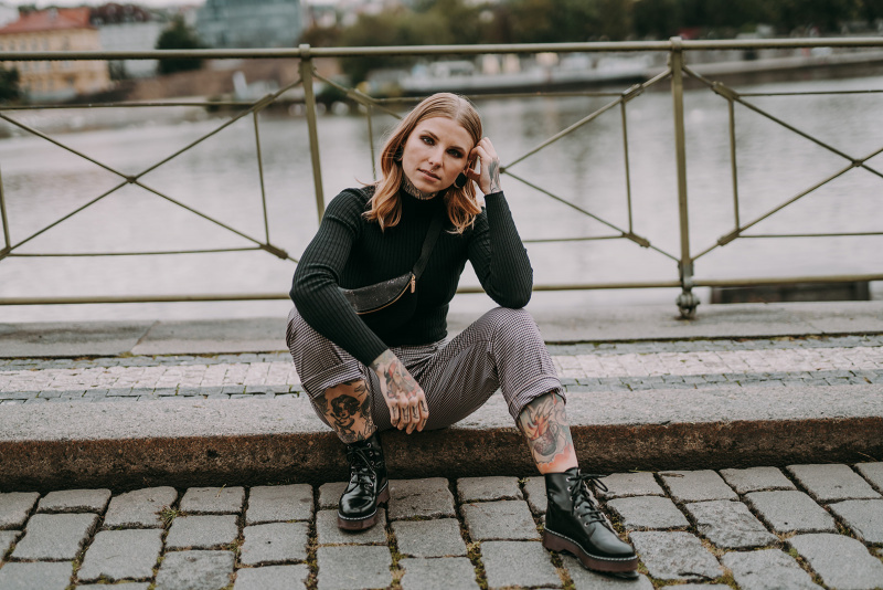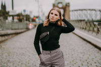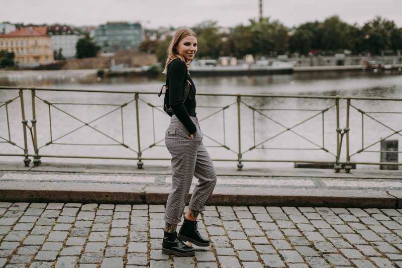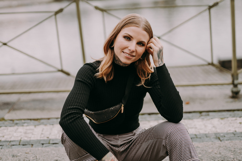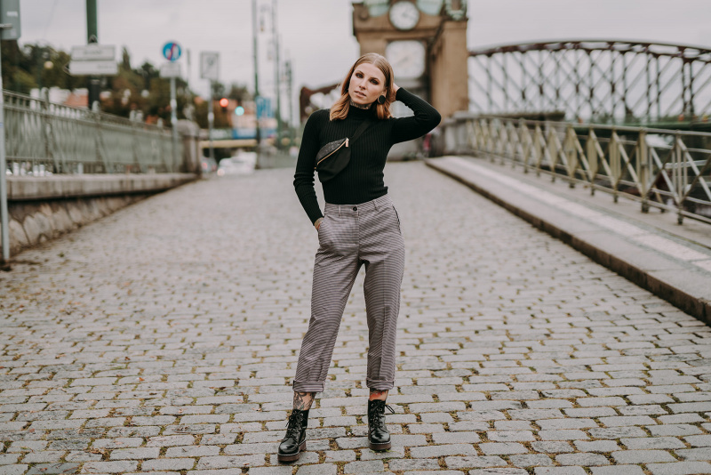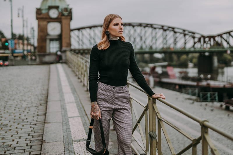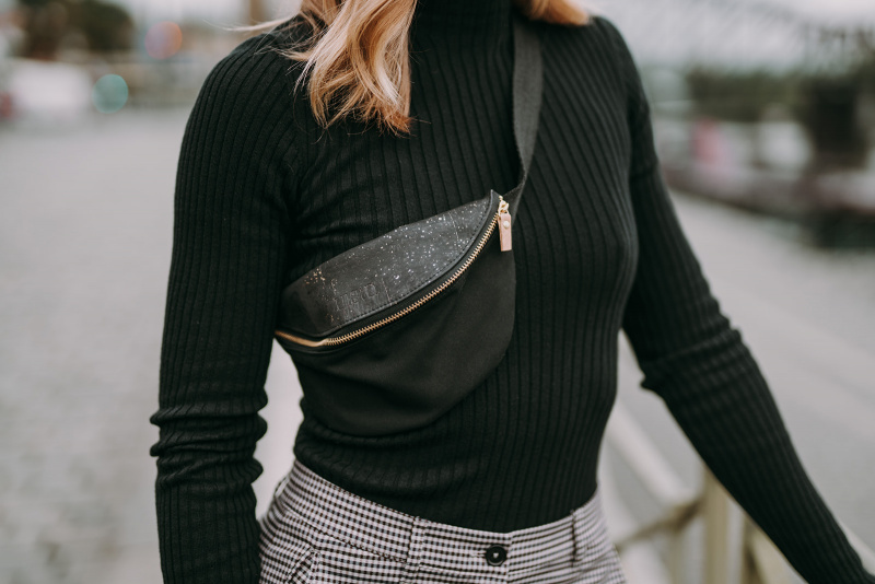 Dewii má na sobě černý žebrovaný rolák „ALAANI black“, který je momentálně vyprodaný, ale lze nahradit např. podobným topem „MALENAA black“ od ArmedAngels a k němu elegantní kalhoty „VARMAA microcheck“ od ArmedAngels, které jinak černý outfit krásně rozbíjí. Jako doplňky jsme pro Dewii vybrali ledvinku z biobavlny, recyklovaných plastů a korku „FAGINEA black/gold“ od značky Ulsto a kotníkové boty „Trina Black“ od Nae Vegan Shoes.