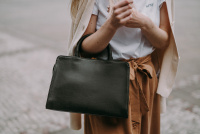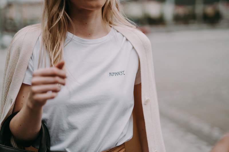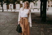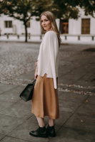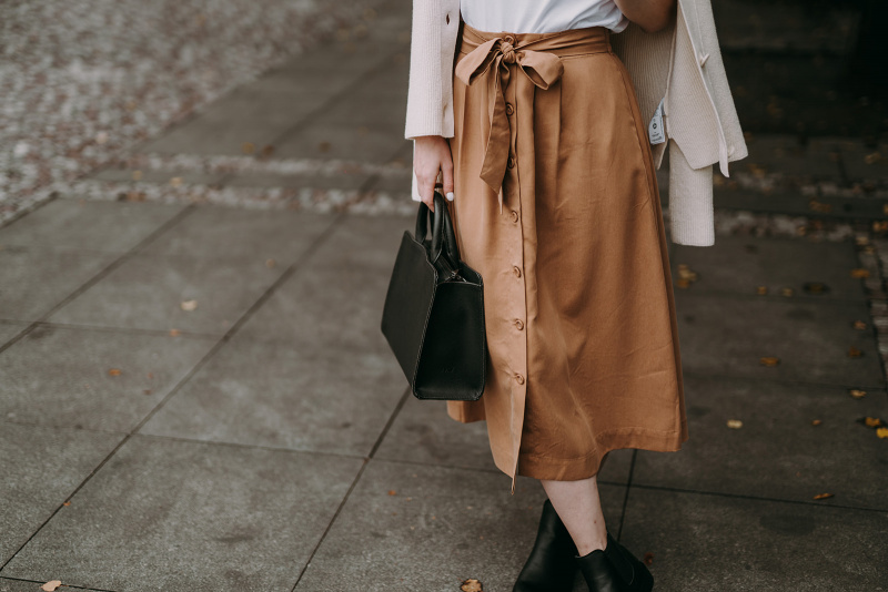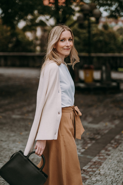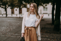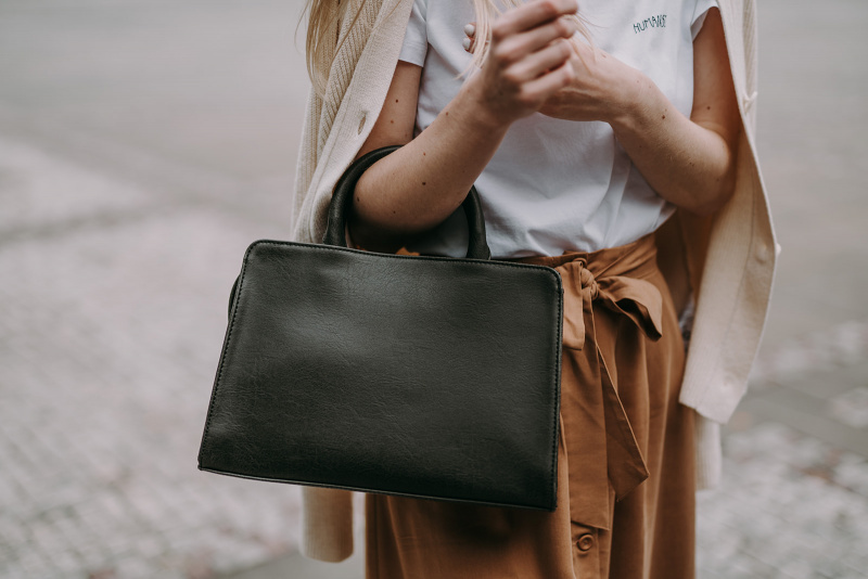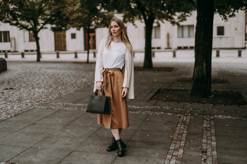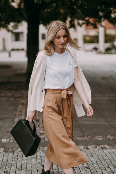 Terka má na sobě minimalistické tričko s výšivkou „MARAA mindset“ doplněné elegantní sukní z eukalyptu „JULIAANA dark caramel“ a krémovým svetříkem „AARIEN luna“, vše od ArmedAngels. Obula si voděodolné černé kotníkové boty „Waterproof Chelsea Boots“ od Will’s Vegan Shoes. Kabelka „VON“ od značky Matt & Nat už není v černé barvě dostupná, ale můžete ji v našem sortimentu najít v hnědé barvě.