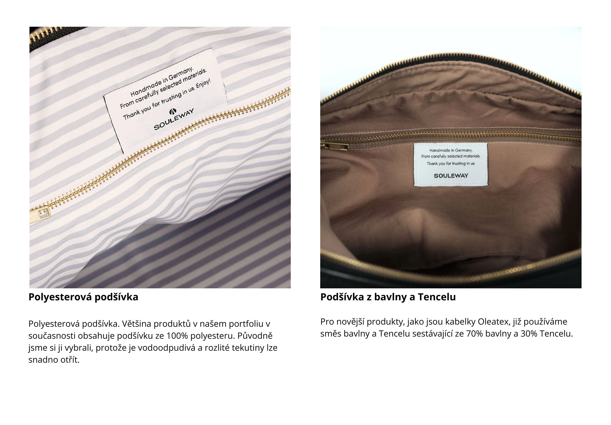 Zatímco polyester a polyuretan dominují v průmyslu s taškami, Souleway se záměrně zaměřuje na přírodní materiály. Jejich první produkty byly vyrobeny z plátna a rostlinně činěné kůže. Odolnost a přírodní kvalita zůstávají dodnes základními principy značky Souleway.